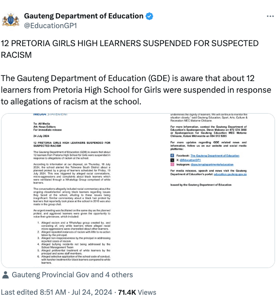 The Pretoria Girls High suspension of 12 pupils has also drawn the attention of various human rights organizations and educational bodies, all calling for a comprehensive review of the school’s policies on racism and discrimination. They emphasize the need for educational institutions to foster an inclusive and respectful environment for all students.