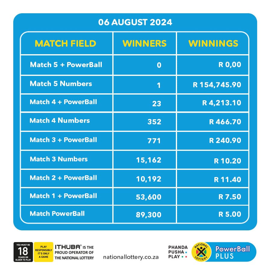 Congratulations to the Powerball winners. The Powerball draw for 06 August 2024 has concluded, and we are excited to announce the Powerball winners of this thrilling lottery event. The Powerball, a popular fixture in South Africa’s gaming landscape, continues to provide excitement and the opportunity for life-changing rewards.
