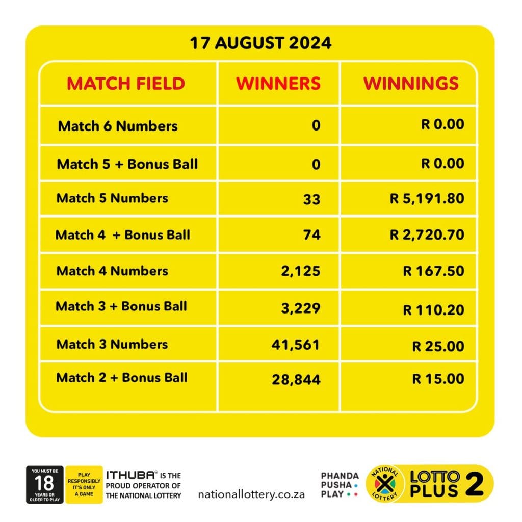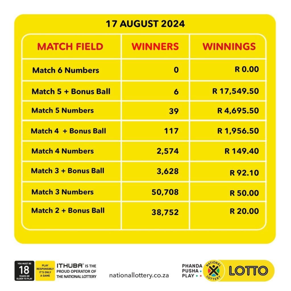 Congratulations to the Lotto Winners. The winning lotto numbers for the Lotto draw on 17 August 2024 are as follows: