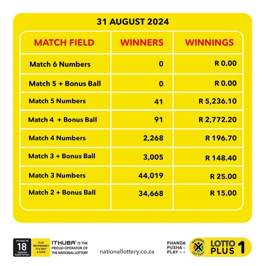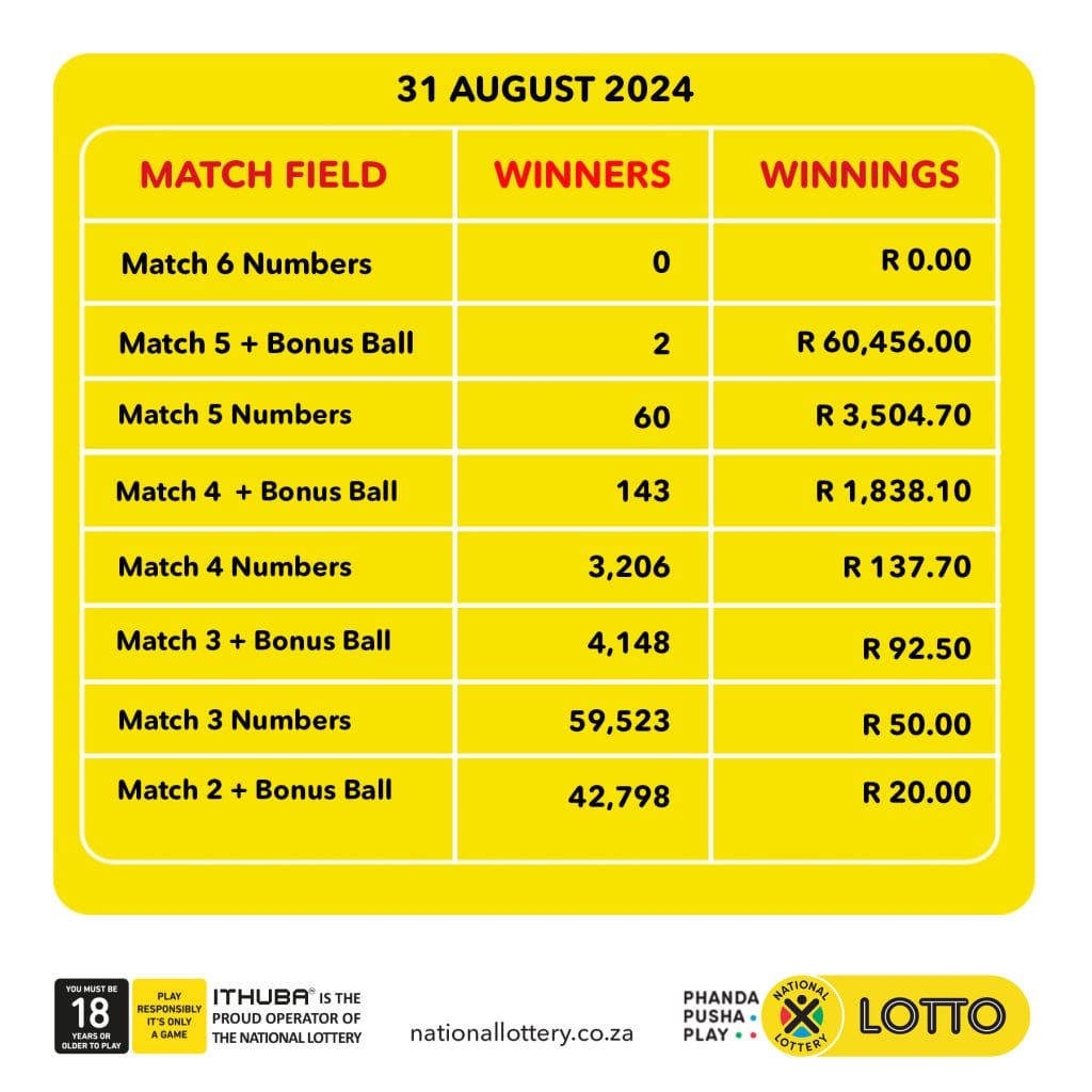 Congratulations to the Lotto Winners. The winning lotto numbers for the Lotto draw on 31 August 2024 are as follows: