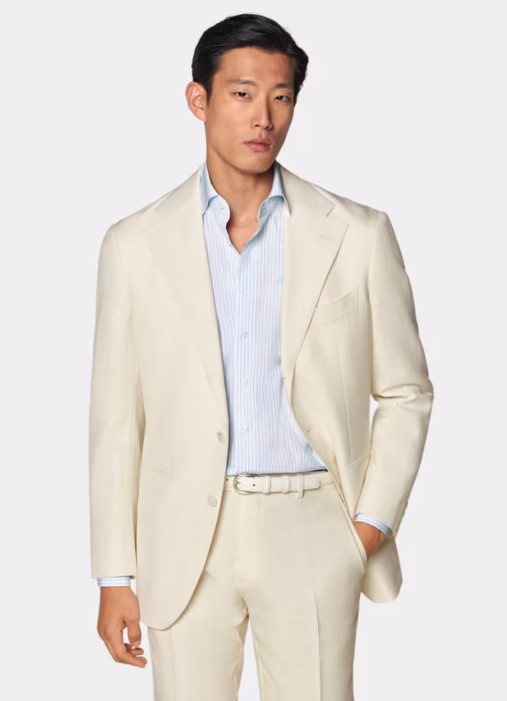 An off-white suit can be a unique alternative to traditional colors. It’s perfect for modern weddings, especially during summer.
