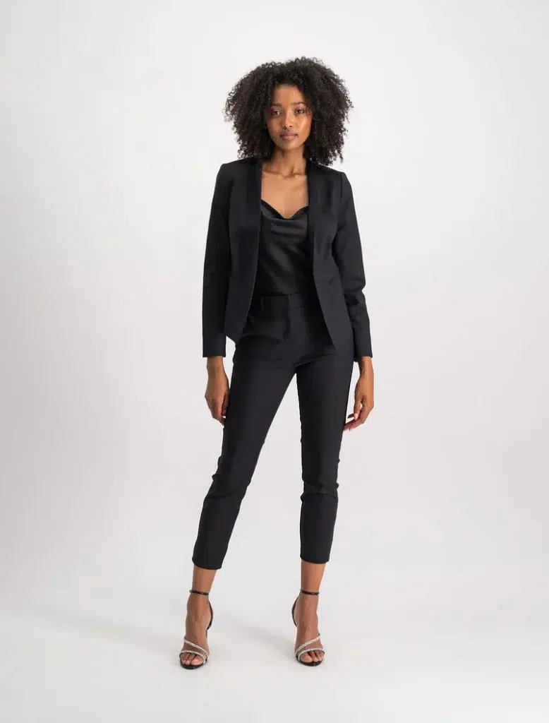 A tailored black blazer with matching trousers is a timeless corporate essential. It’s sleek, sophisticated, and appropriate for any business setting. A timeless piece in office fashion.