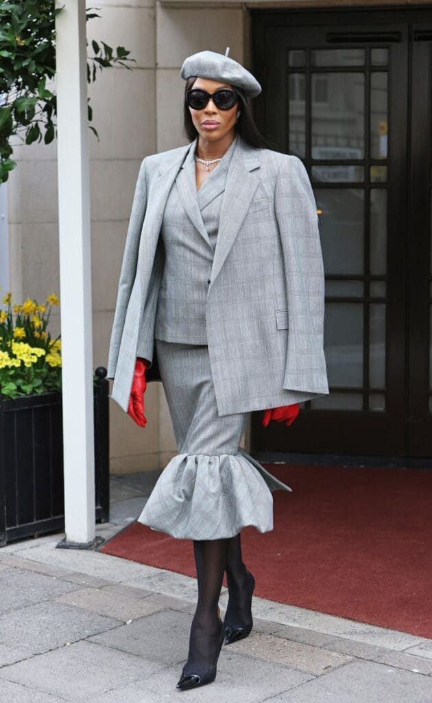 A double-breasted grey blazer with a matching pencil skirt creates a structured and elegant outfit. This look is perfect for board meetings or executive roles.
