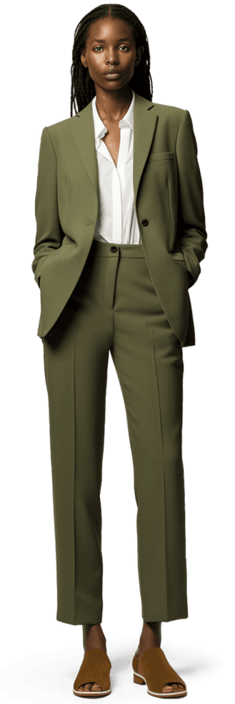 A beige or neutral-toned suit offers versatility and can be styled with a variety of blouses or accessories. It’s ideal for warmer weather or a more casual corporate environment.