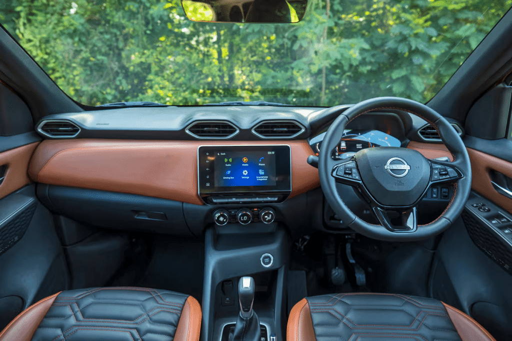 The top-end Magnite Acenta Plus variant comes loaded with a range of premium features, such as a new 8-inch touchscreen infotainment system with wireless Apple CarPlay and Android Auto, alongside a revised 7-inch digital instrument cluster. It also boasts a two-tone leatherette interior option, combining black and brown, although the colour choice might not suit everyone. Nissan has added a heat-resistant coating to the seats, which helps keep them cool under the sun. Other creature comforts include ambient lighting, keyless start/stop, remote engine start, an air purifier, and a 360-degree camera for added convenience.