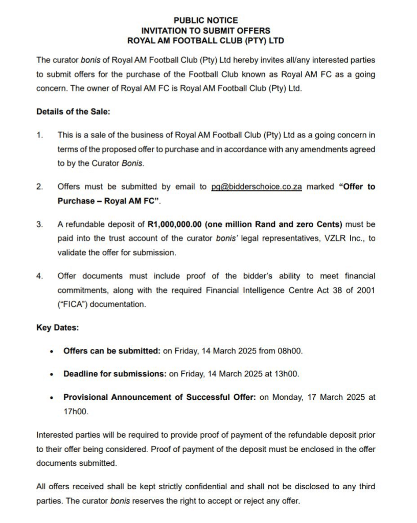 Royal AM has faced a series of financial issues that have left them unable to meet their obligations. A ruling by the KwaZulu-Natal High Court ordered the club to disclose potential buyers to a SARS curator in a transparent process, and the auction marks the next step in that process. The club owes R40 million in taxes to SARS, while also failing to pay wages to their players.