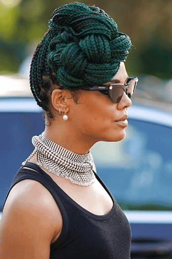 This style combines two trendy looks: a pompadour and a ponytail. By pinning box braids into loose buns at the front, you create a voluminous faux mohawk while keeping the back sleek.