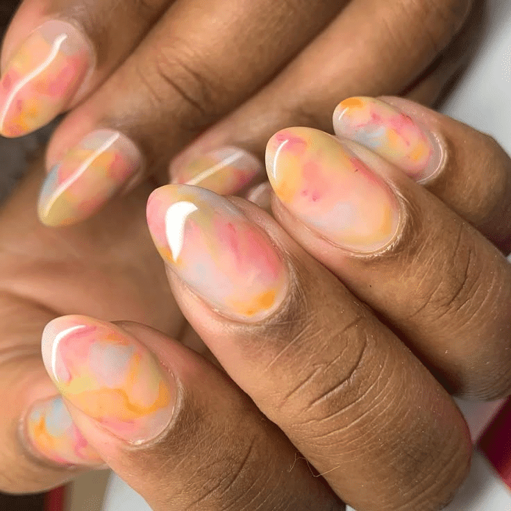 Inspired by watercolor paintings, this technique blends soft, sheer colors for a delicate and artistic manicure.