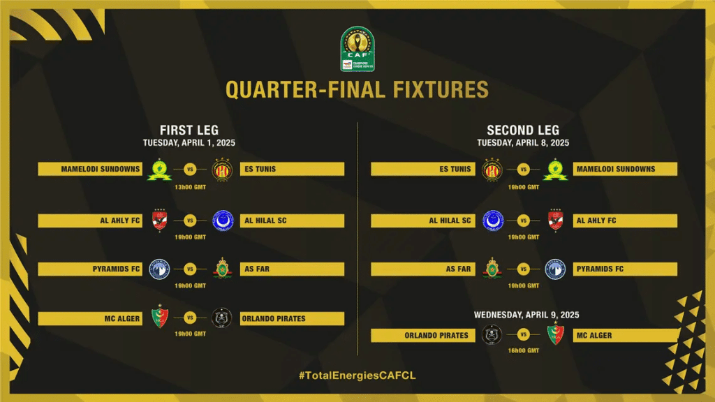 The Confederation of African Football (CAF) has confirmed the fixture dates and kick-off times for the highly anticipated 2024-25 TotalEnergies CAF Champions League and TotalEnergies CAF Confederation Cup Quarter-finals. South African clubs Mamelodi Sundowns, Orlando Pirates, and Stellenbosch FC are all set to battle for continental glory.