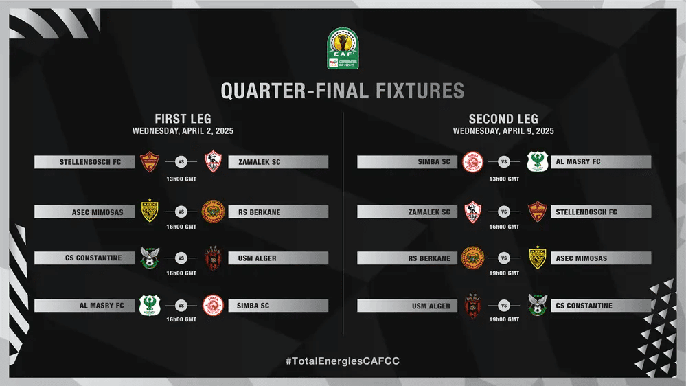 South African debutants Stellenbosch FC will host Egyptian giants Zamalek SC at Cape Town Stadium in their first-leg quarter-final on Wednesday, April 2, at 13h00 GMT. The second leg will see them travel to Cairo International Stadium on Wednesday, April 9, with kick-off set for 16h00 GMT. The winner of this tie will face either Simba SC or Al Masry in the semi-finals.