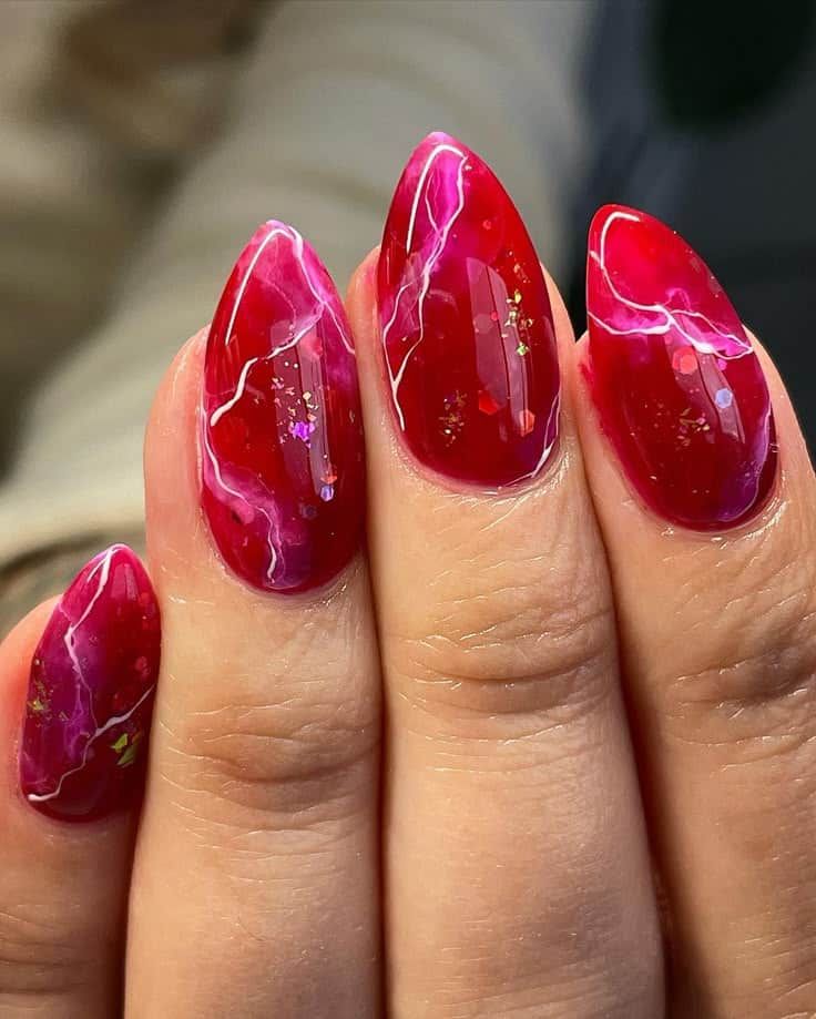 Red marble nails make a bold statement. Whether you opt for a fiery red or a more muted reddish-pink, the marble design will be striking and elegant. Red marble nails feature a red base with golden accents, making this design a perfect choice for those who love vibrant, eye-catching styles.