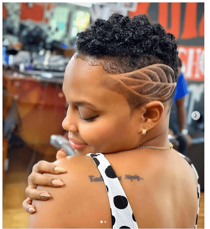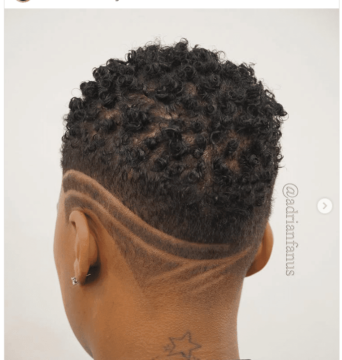 Curly hair is always in vogue, and the curly top with an all-around trim is perfect for adding some flair to your natural curls. The leaf design shaved along the side or back adds an elegant, nature-inspired touch to the look. It’s a stylish and creative haircut that celebrates both texture and design.