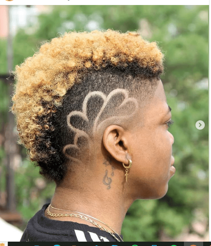 A curly low mohawk with a two-line design on the side combines texture with geometric style. The curls on top provide volume and bounce, while the two sharp lines on the side give the cut structure and definition. It’s a fresh take on the mohawk that adds a soft yet bold twist.