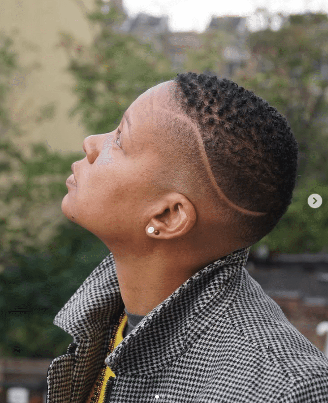 The high-top curly fade with a simple line design is a chic, modern cut that plays with volume and contrast. The curly top adds height and texture, while the clean fade on the sides ensures a neat, polished appearance. The simple line design adds just the right amount of detail to make this look pop.