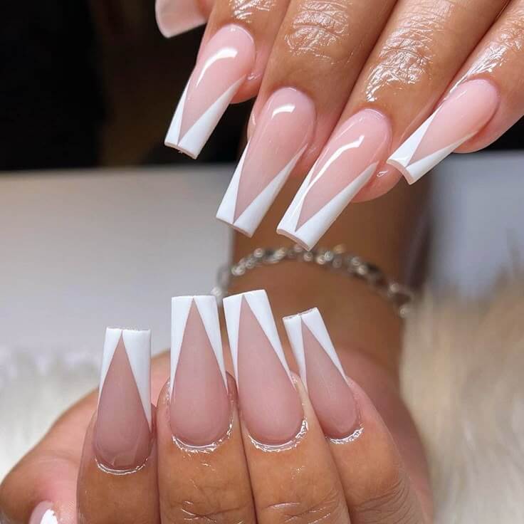 Instead of the conventional straight-across tip, opt for a V-shaped design. This edgy style elongates the appearance of your nails and adds a contemporary flair to the classic French manicure.​