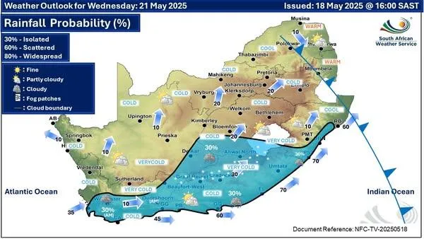 South Africa is bracing for an unseasonal cold snap this week as a powerful cold front brings icy temperatures, snow, and severe weather conditions across multiple provinces. The South African Weather Service (SAWS) has issued several warnings, including a Yellow Level 4 alert for damaging winds and waves in the Western Cape, signalling the onset of a significant weather event.