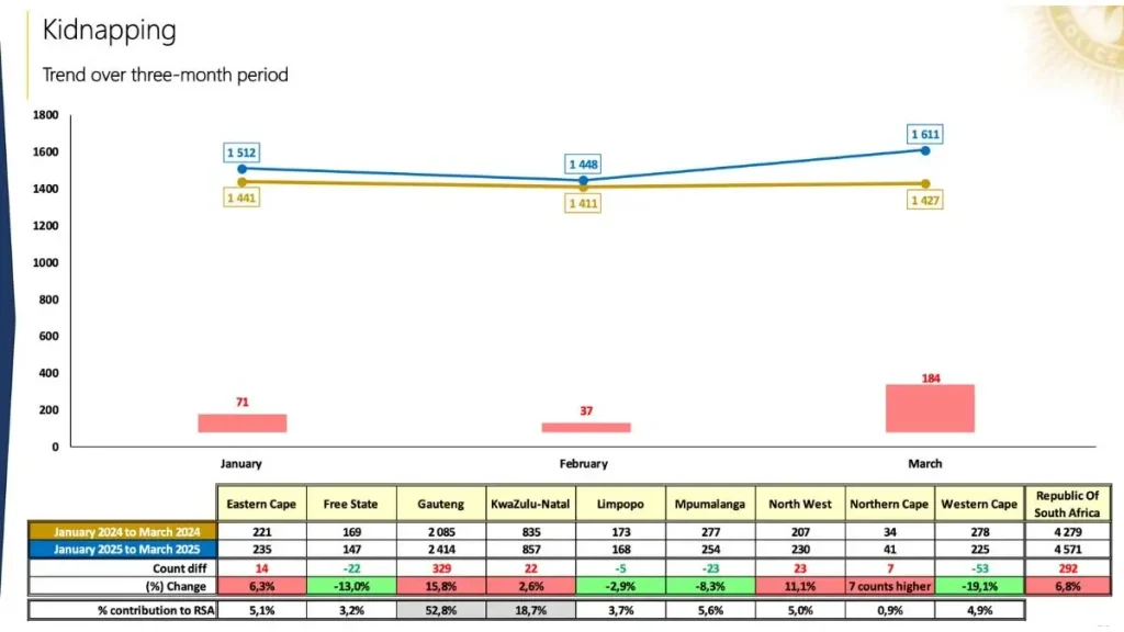 The broader crime statistics underscore the urgency of the situation. SAPS’ 2025 first-quarter crime stats (Jan–March) show that 4,571 kidnappings were reported in just three months—a 6.8% increase year-on-year from 2024. That translates to 51 kidnappings every day.