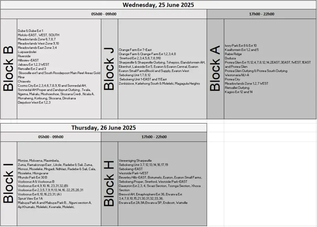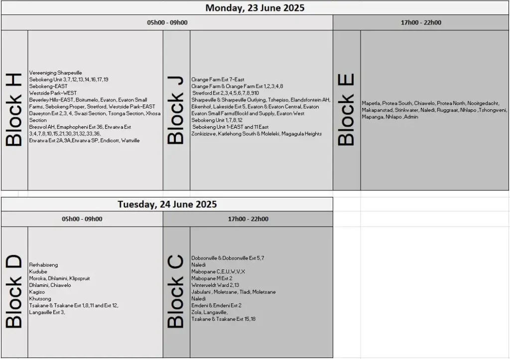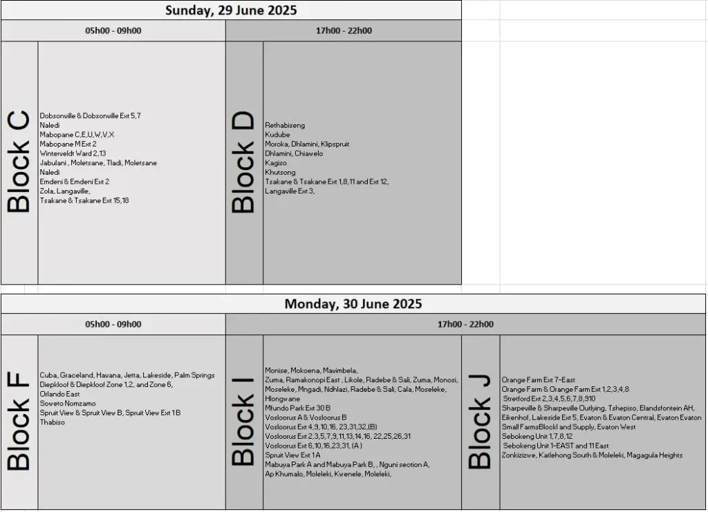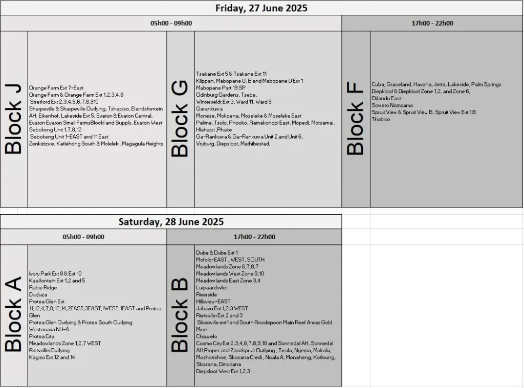 TAGGED:Eskom Gauteng scheduleEskom load reduction June 2025Gauteng power cutsJohannesburg Power Outagesload shedding schedulepeak hour electricity cutsPretoria load reductionSouth Africa electricity update