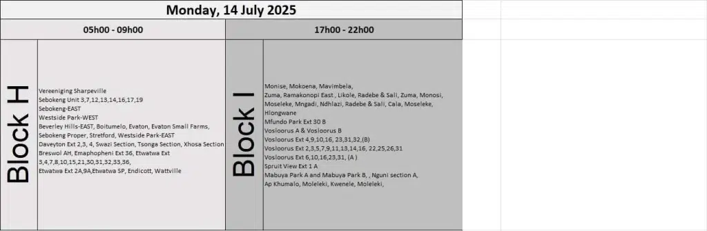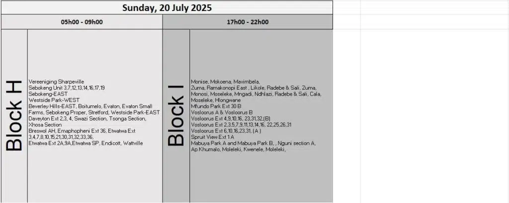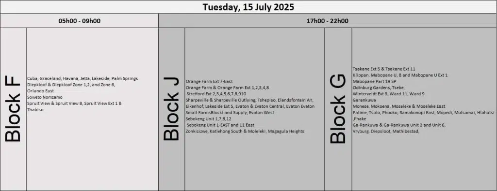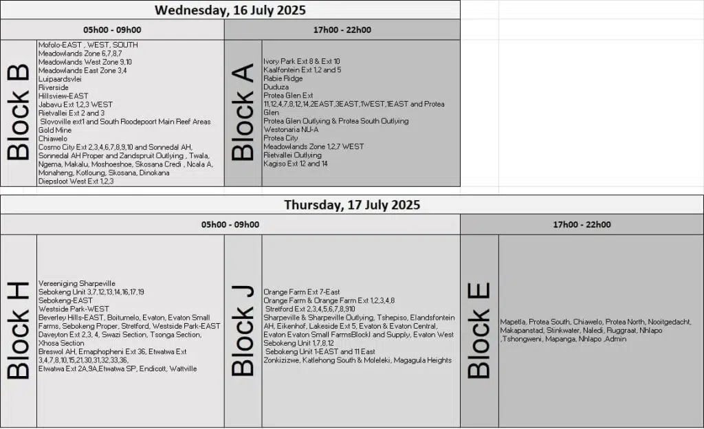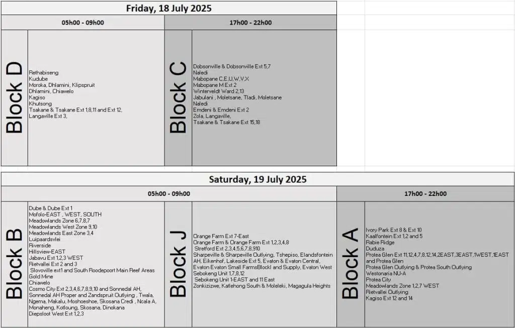According to Eskom’s July 2025 load reduction schedule, the following areas are set to experience planned power cuts on rotation: