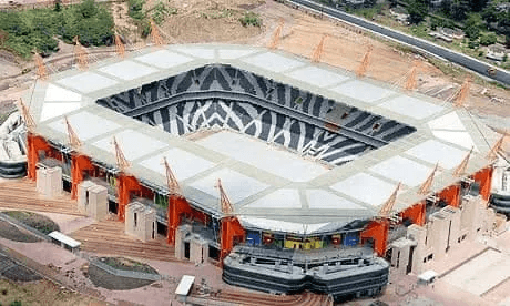 Located in Nelspruit, about 40 kilometres from Kruger National Park, Mbombela Stadium was designed to reflect the region’s African roots. Its giraffe-coloured roof columns and black-and-white seating are instantly recognisable, while its construction costs of R1.2 billion made it one of the most cost-efficient stadiums built for the World Cup.