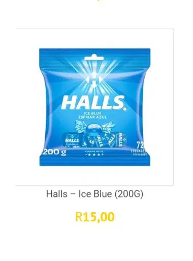 Halls Ice Blue (200G) offers a refreshing menthol hit for just R15. These lozenges are great for flu season or just keeping your breath fresh during the day.