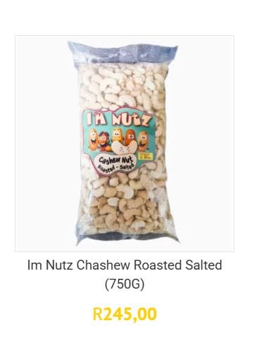Snacking doesn’t have to be unhealthy. The Im Nutz Cashew Roasted Salted (750G) pack is a high-protein option priced at R245. Perfect for gym-goers, lunchboxes, or as a work snack.