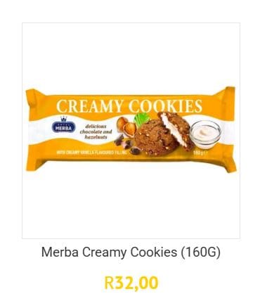 Merba Creamy Cookies (160G) are going for R32—a tasty snack that’s easy on your budget. Perfect with tea, coffee or as a quick dessert.