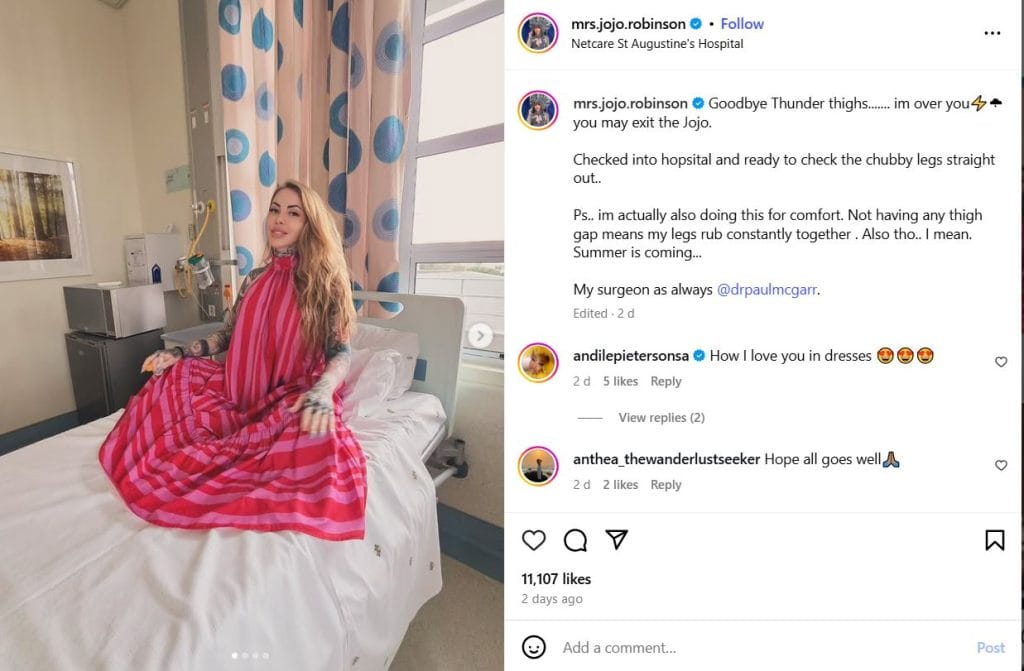Jojo Robinson’s decision was influenced by more than just external appearances. “I’m actually also doing this for comfort,” she wrote, acknowledging that the physical discomfort from her thighs rubbing together had affected her daily life. This decision reflects an important shift in how many people approach cosmetic surgery: prioritising their own physical comfort and mental well-being over societal expectations.