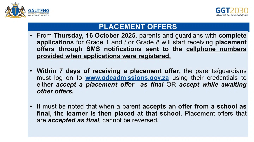 The Gauteng Department of Education (GDE) started rolling out 2026 placements on 16 October 2025. This process is phased, meaning not all parents will get SMS notifications on day one.