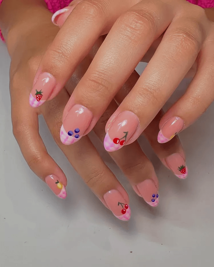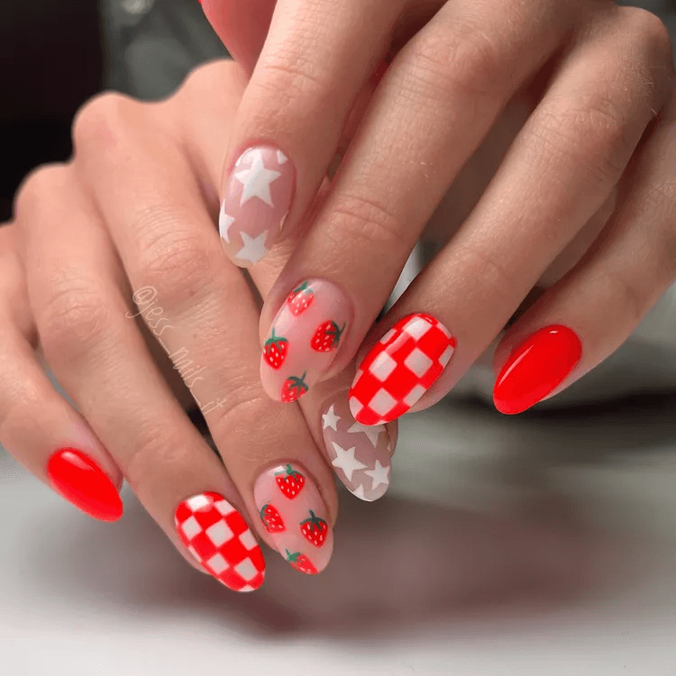 Add some fun to your winter look with strawberry-themed nails. These cute designs, featuring strawberries and checkerboard patterns, are perfect for embracing a playful, sweet vibe, no matter the season.