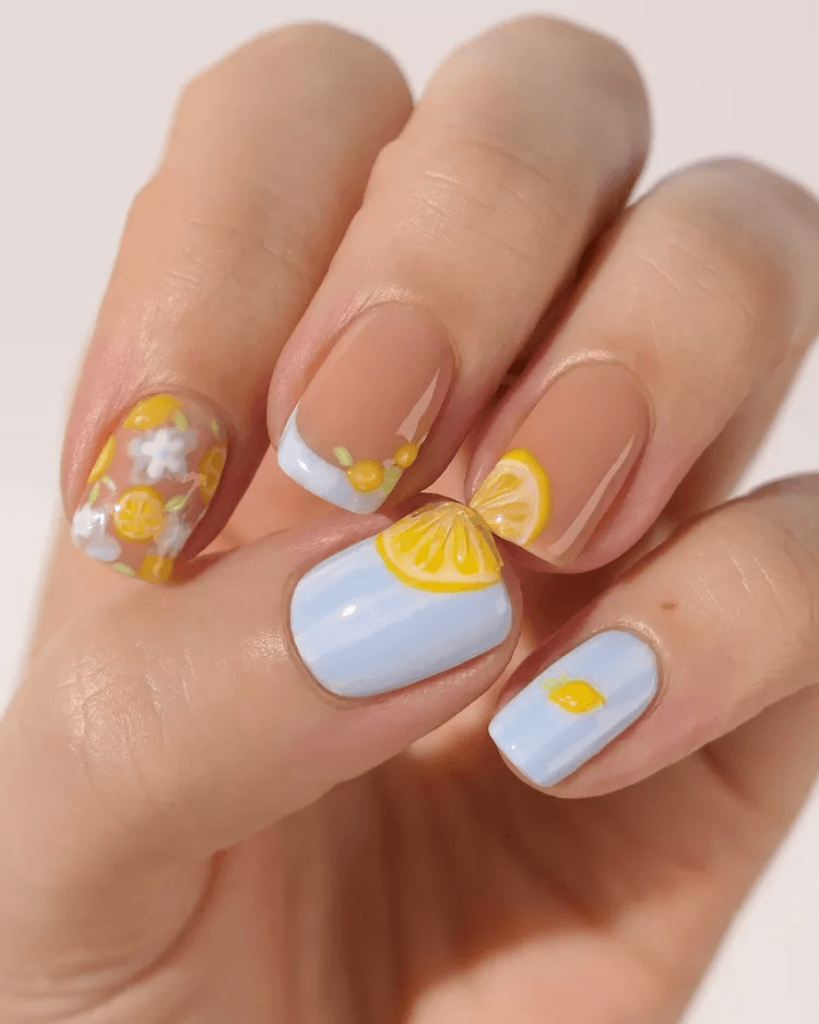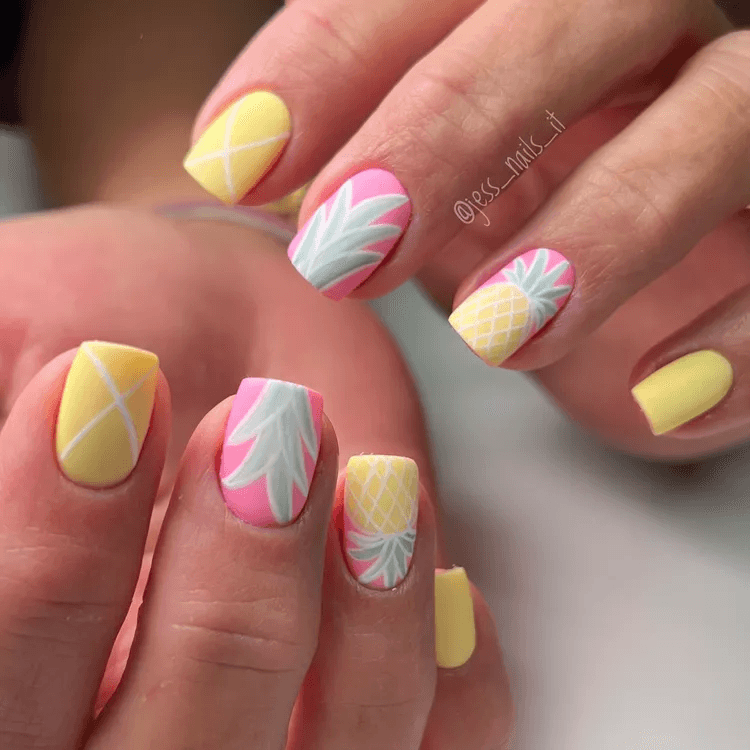 Give your nails a tropical twist with pineapple-themed designs. Combining yellow and pink with cute pineapple illustrations, these nails bring a fun, cheerful vibe that’s perfect for escaping the winter blues.