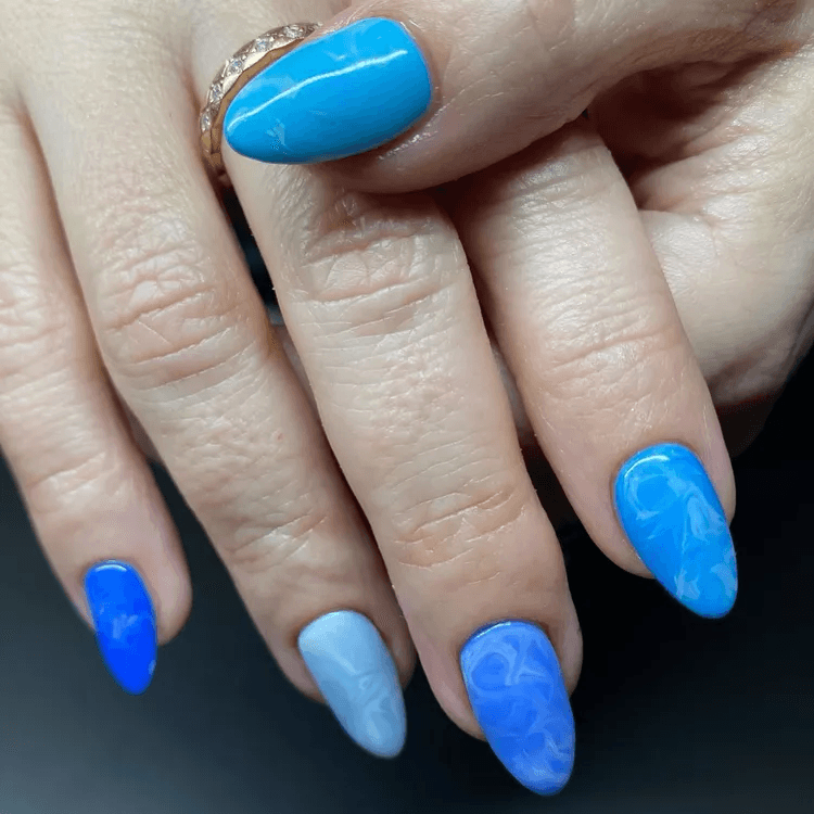 Bring a refreshing splash of colour to your nails with pool water-inspired blue designs. These shimmering blue nails mimic the cool, clear waters of a pool, perfect for making a statement in the chilly winter weather.