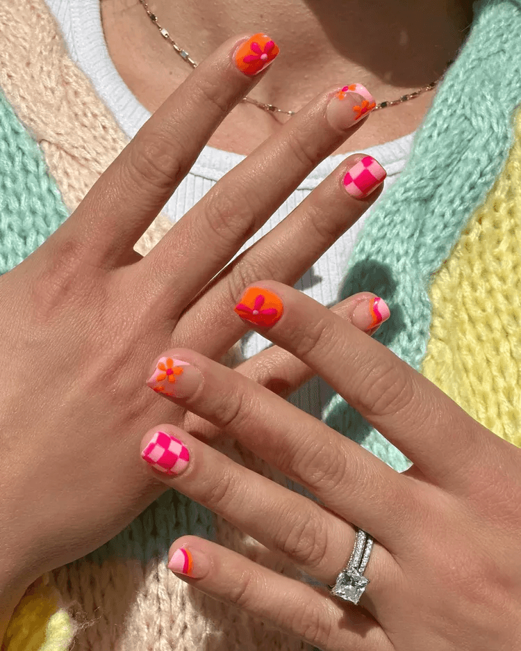 Embrace the boldness of neon pink and orange, the ultimate colours of the Y2K era. Pairing these hues with fun patterns like checkerboard or French tips gives your nails a nostalgic yet trendy feel.