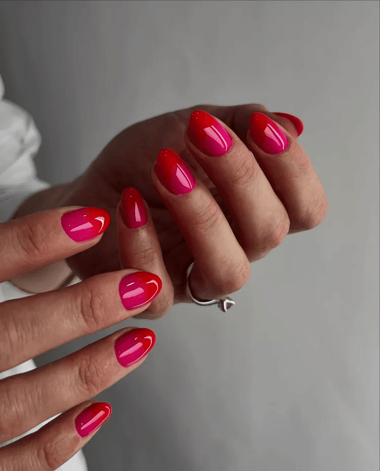 Capture the magic of a summer sunset with red and pink ombré nails. This two-toned design is the perfect way to blend warm and cool tones, making it suitable for both day and evening looks.