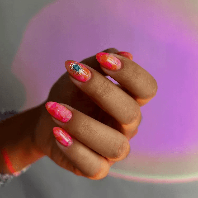 Who says you can’t sparkle in winter? Add a little glamour to your nails with pink and orange tie-dye nails adorned with turquoise gems. This design is perfect for adding a touch of luxury and creativity to your look.
