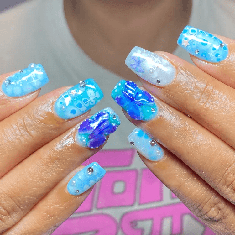 Bring a touch of nature to your winter nails with 3D butterfly designs. Paired with a sparkly blue base, these nails are the perfect combination of whimsy and elegance, sure to capture attention.