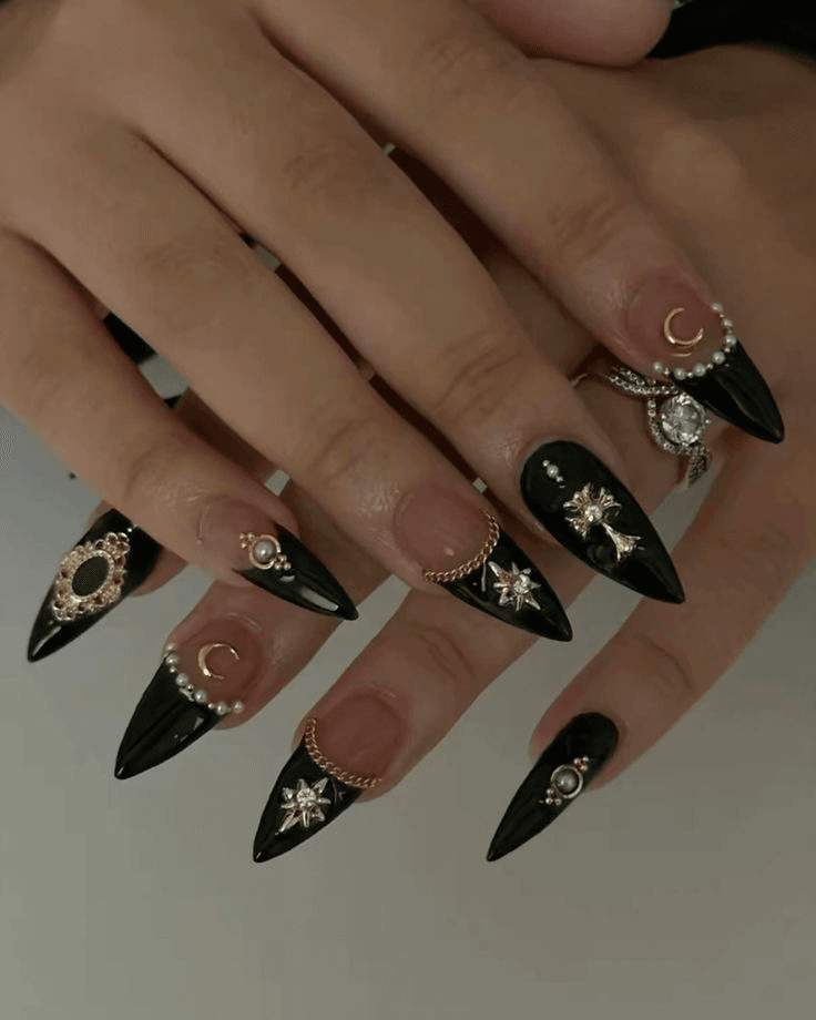 If you’re feeling a bit more daring this winter, why not go for a gothic-inspired look? Black nails with silver accents, whether it’s tiny stars, studs, or geometric lines, are a bold choice that still feels chic and glamorous.