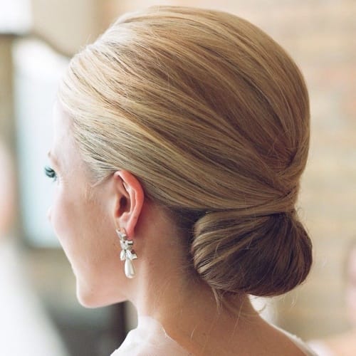 A sleek low bun is modern and elegant. This hairstyle works beautifully with contemporary bridal gowns and is perfect for showcasing jewelry.