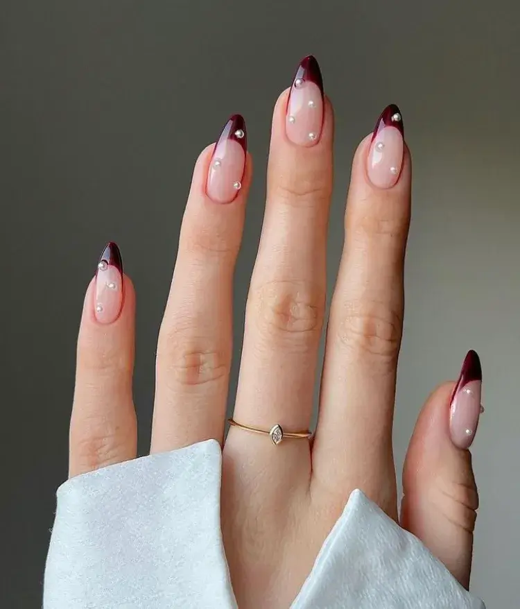 - Rich burgundy is an ideal choice for holiday French tips, adding warmth and elegance to your nails.