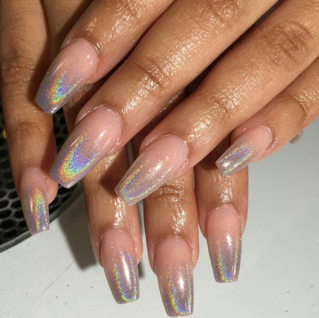 - Opt for holographic tips for a futuristic twist on the French manicure. This look is fun and trendy, especially under holiday lights.