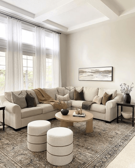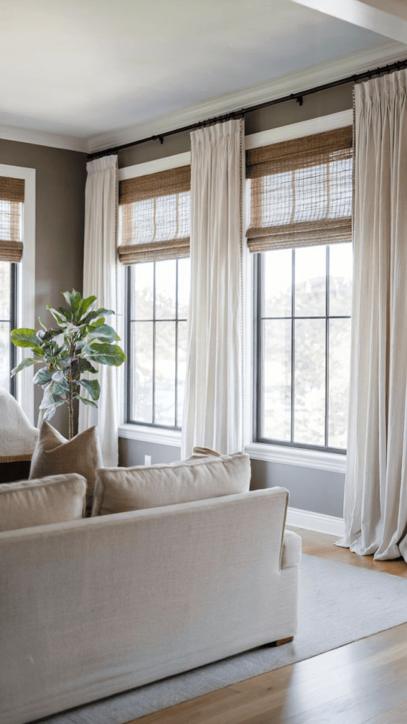 Windows are often overlooked in living room makeovers, but well-designed treatments can completely transform a space. For an affordable yet stylish look, layer woven roller shades (like bamboo) with flowing drapes. This combination adds depth and elegance, making your living room feel polished and complete.
