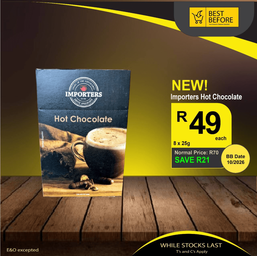 - Importers Hot Chocolate – Was R70, now only R49 (Save R21).