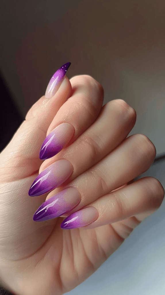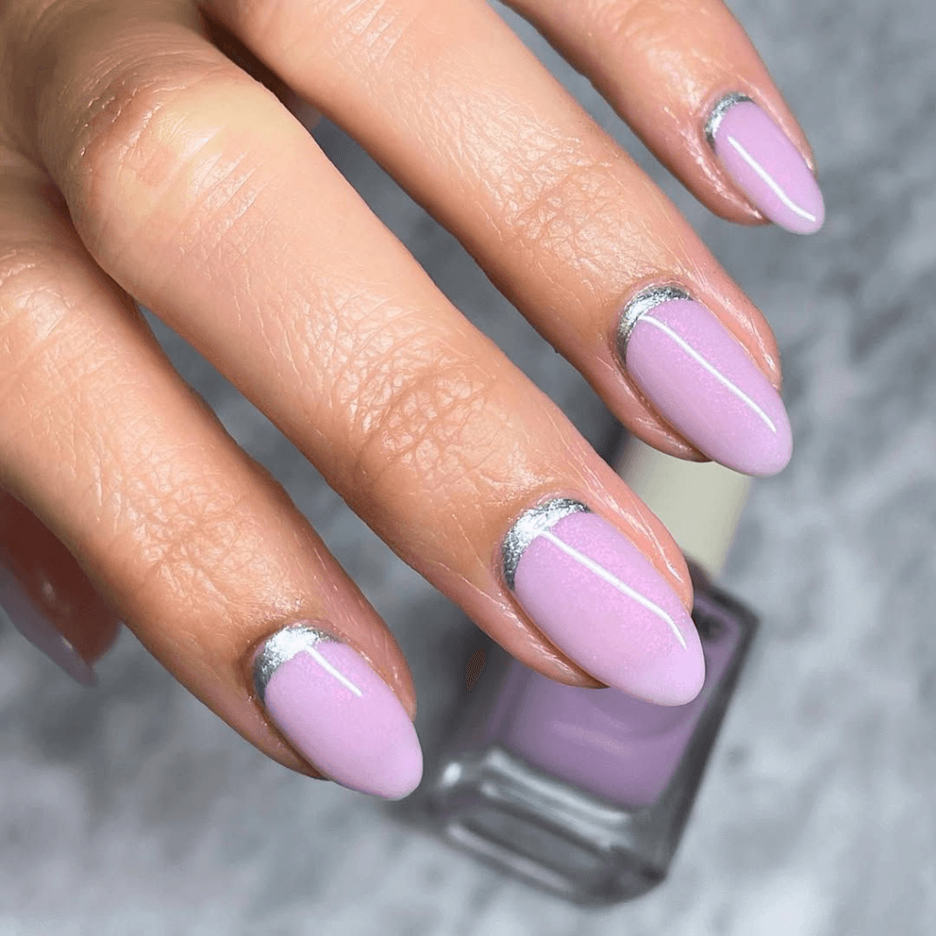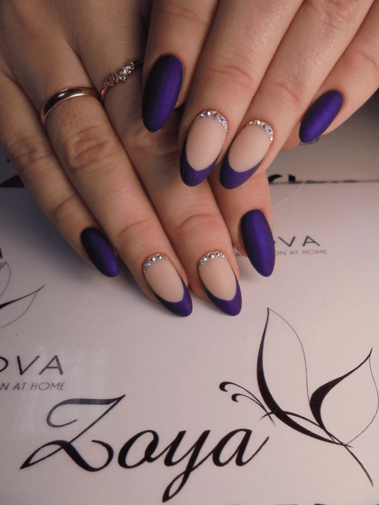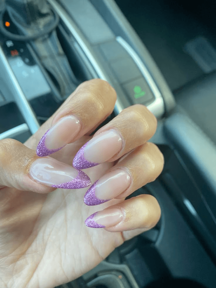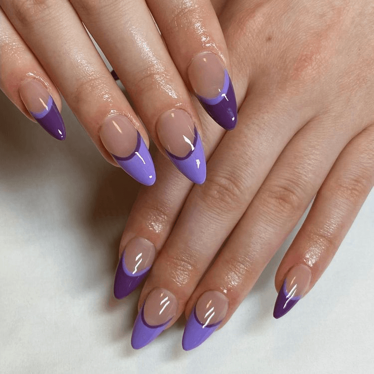 Combine two shades of purple for a two-tone tip. Use a lighter violet near the nail bed and a darker shade at the tip. This dual-tone design adds depth and uniqueness to your manicure.