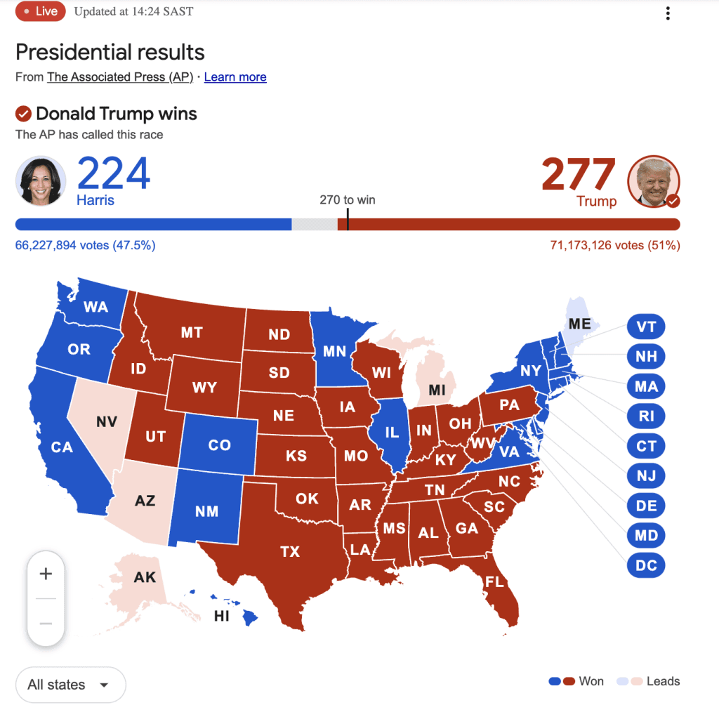 After a closely contested campaign against his Democratic opponent, Kamala Harris, Trump clinched critical swing states, ensuring a path to the 270 electoral votes needed for the presidency. His campaign focused on themes of economic renewal, national security, and addressing concerns about the future direction of the country. With a significant voter turnout, Donald Trump’s 2024 election win reflects continued strong support from his base, as well as growing support in key demographics that helped tip the scales in his favor.