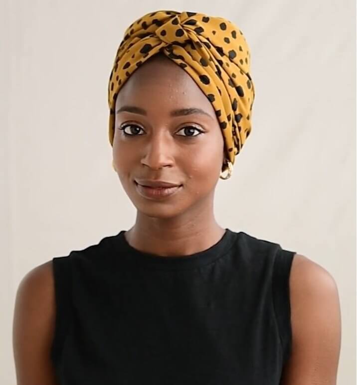 • Wrap the doek over your head, twist it upward, and form a knot at the top.