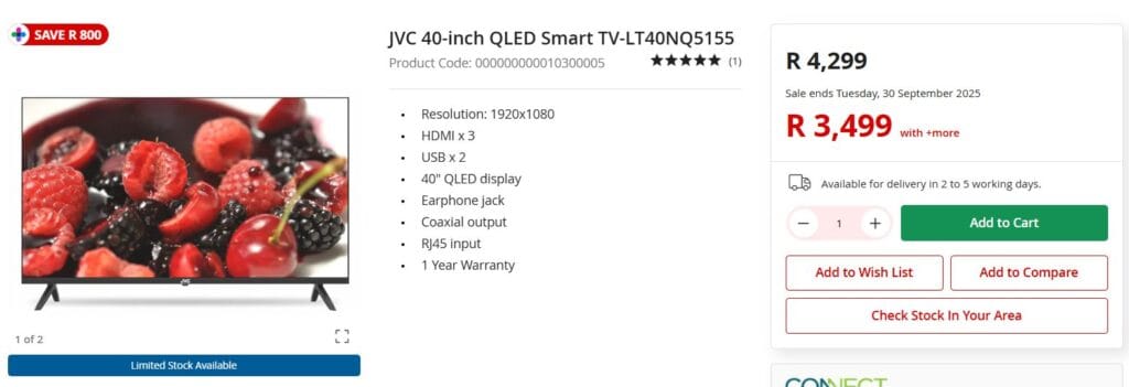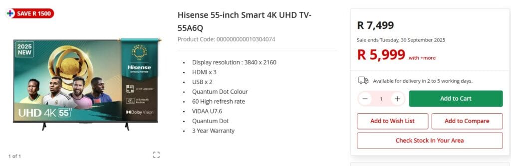 The Hisense 55A6Q offers a huge 55” 4K UHD display, crisp visuals, and a smooth VIDAA operating system. Despite its size and features, it’s available for R5,999 at multiple retailers.