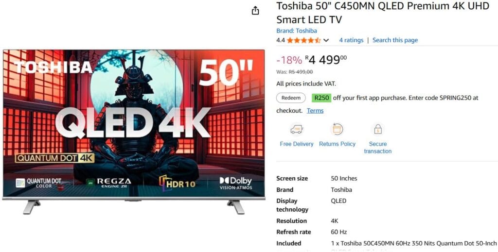 If vibrant colours matter to you, the Toshiba C450MN offers a QLED display in a 50” format. It’s one of the few QLED options under R6000.