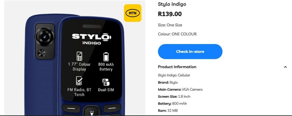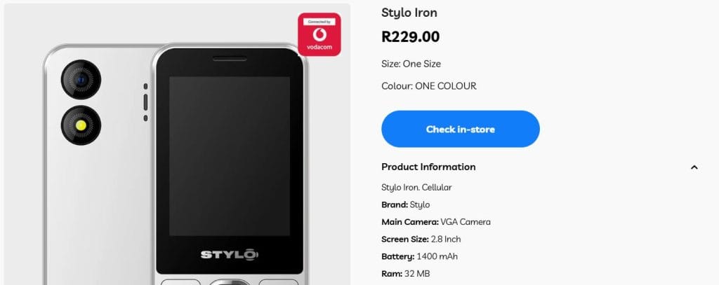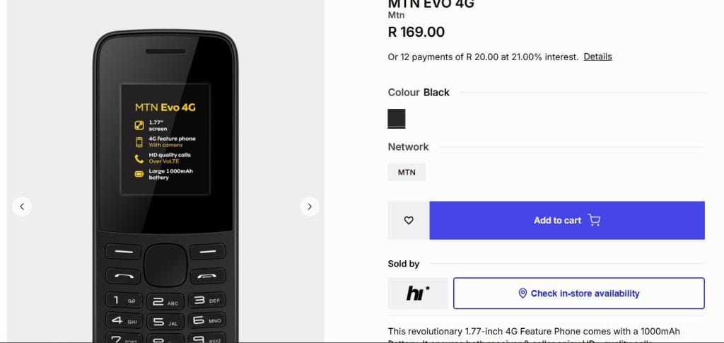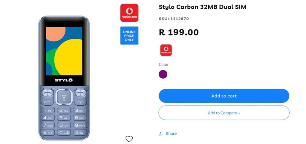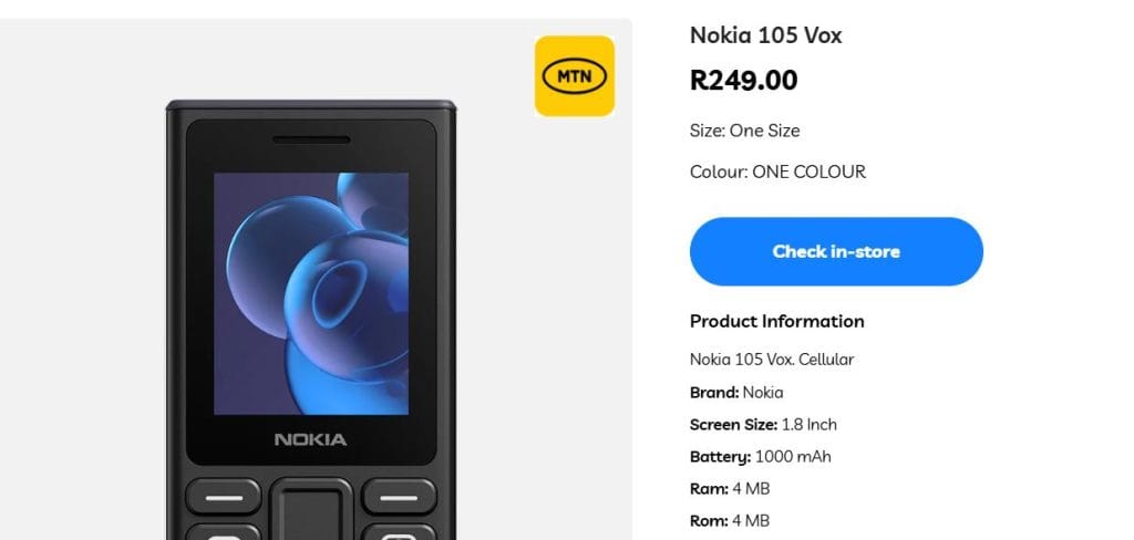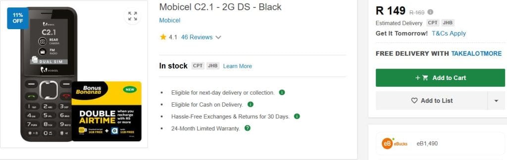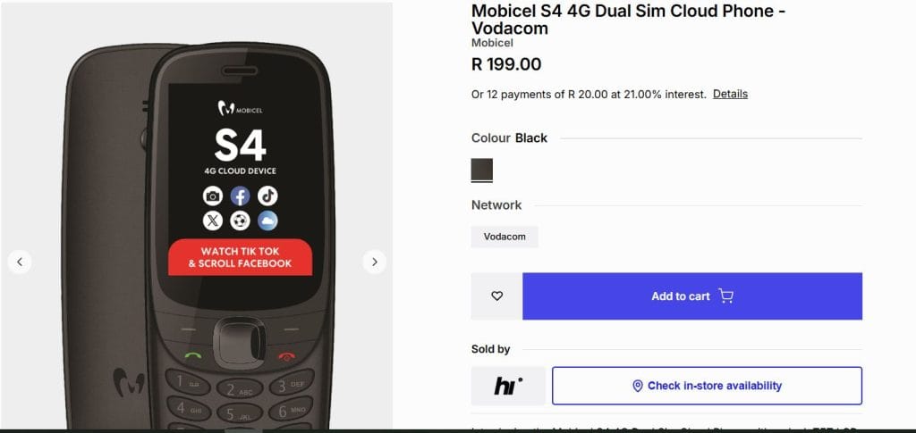 This device offers one of the lowest price points in the market. It’s listed at R149 on Takealot. Dual SIM, basic display and very simple features make it ideal for budget‑conscious users.