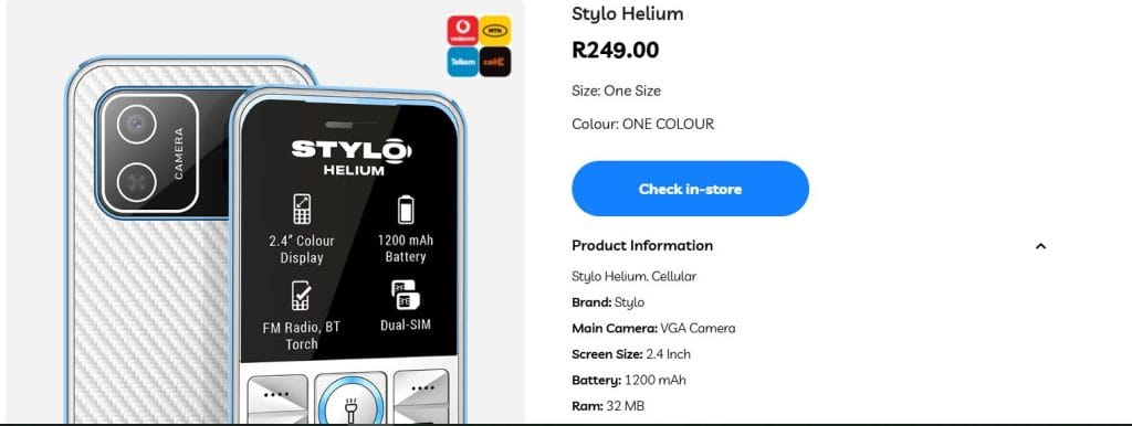 Another extremely affordable model, the Mobicel S4 is shown in PEP’s mobile range for around R149. Suitable as a backup or for someone who needs minimal functionality.