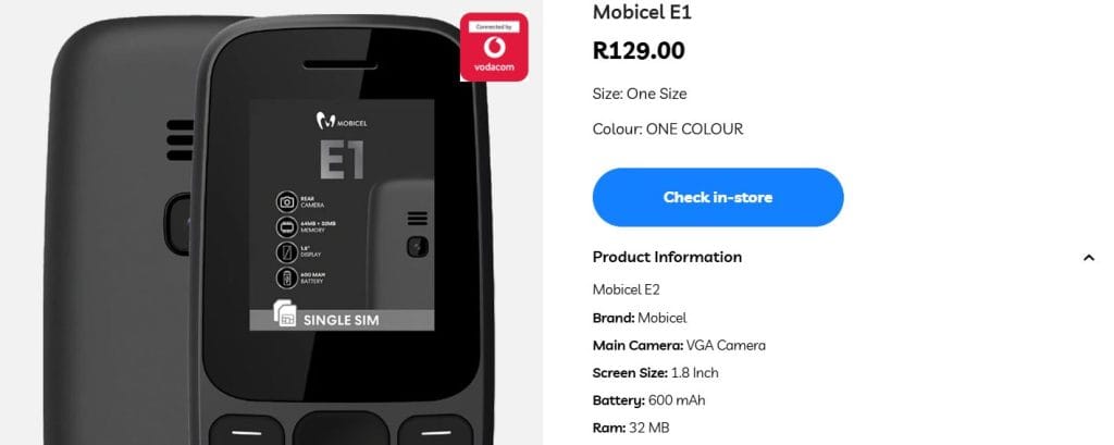 An ultra‑budget option, the Mobicel E1 is listed at R129 in some specials. It is minimalistic but fits a very tight budget while keeping basic communication coverage